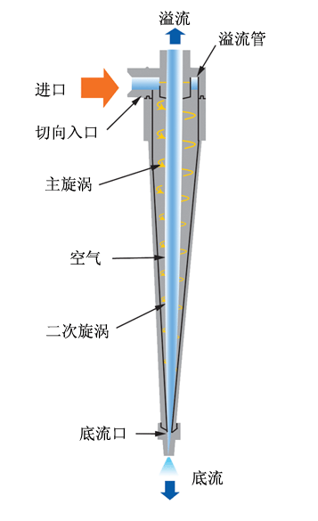 旋流分离器的基本构造为一个圆锥形腔体,有一个切向进口和两个轴向出口。它是一种 离心沉降原理将非均相体系中具有不同密度的相分离的机械分离设备。油水混合液用泵从切向进口注入旋流分离器,从而在旋流分离器内高速旋转,产生离心力场。在这离心力的作用下,密度大的相——水被甩向四周,并顺着壁面向下运动,作为底流排出;密度小的相——油被带到中间并向上以内动,最后作为溢流排出。这样,用旋流分离器就达到油水分离的目的。
